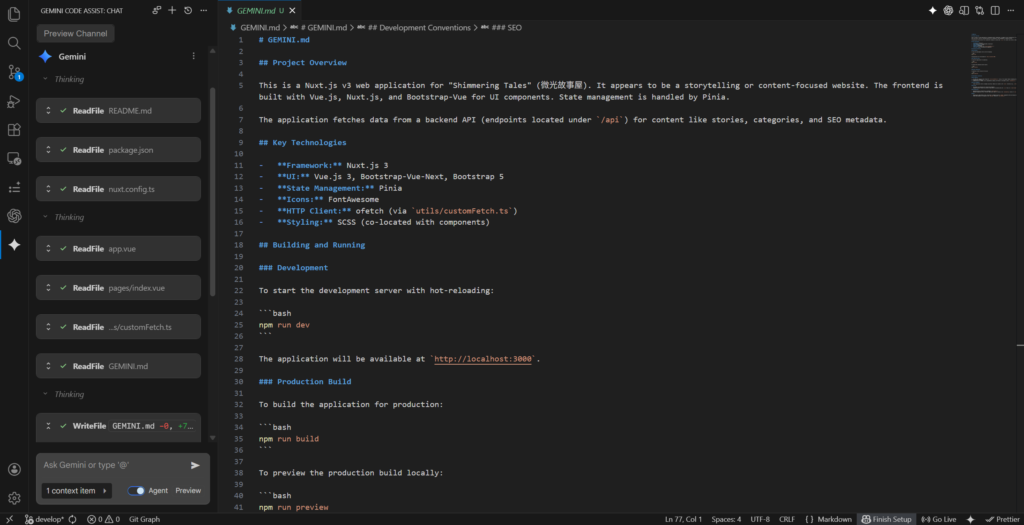 使用方法也是一樣下載後登入帳號,就可以開始跟 Gemini 聊天啦!這邊我用了 /init 的指令給 Gemini,它會幫我掃描整個專案,最後整理出一個 md 檔,內容會簡略說明這個專案的目的、使用技術等,因為掃一個專案會消耗大量的 token,所以我們盡量在一開始產出這樣的檔案,這樣未來給它任何的 task 時引用這個 md 檔,就能讓 Gemini 快速進入狀況,避免讓它多次掃描檔案消耗過多的 token。一起努力在這個領域探索更多未知的有趣吧~